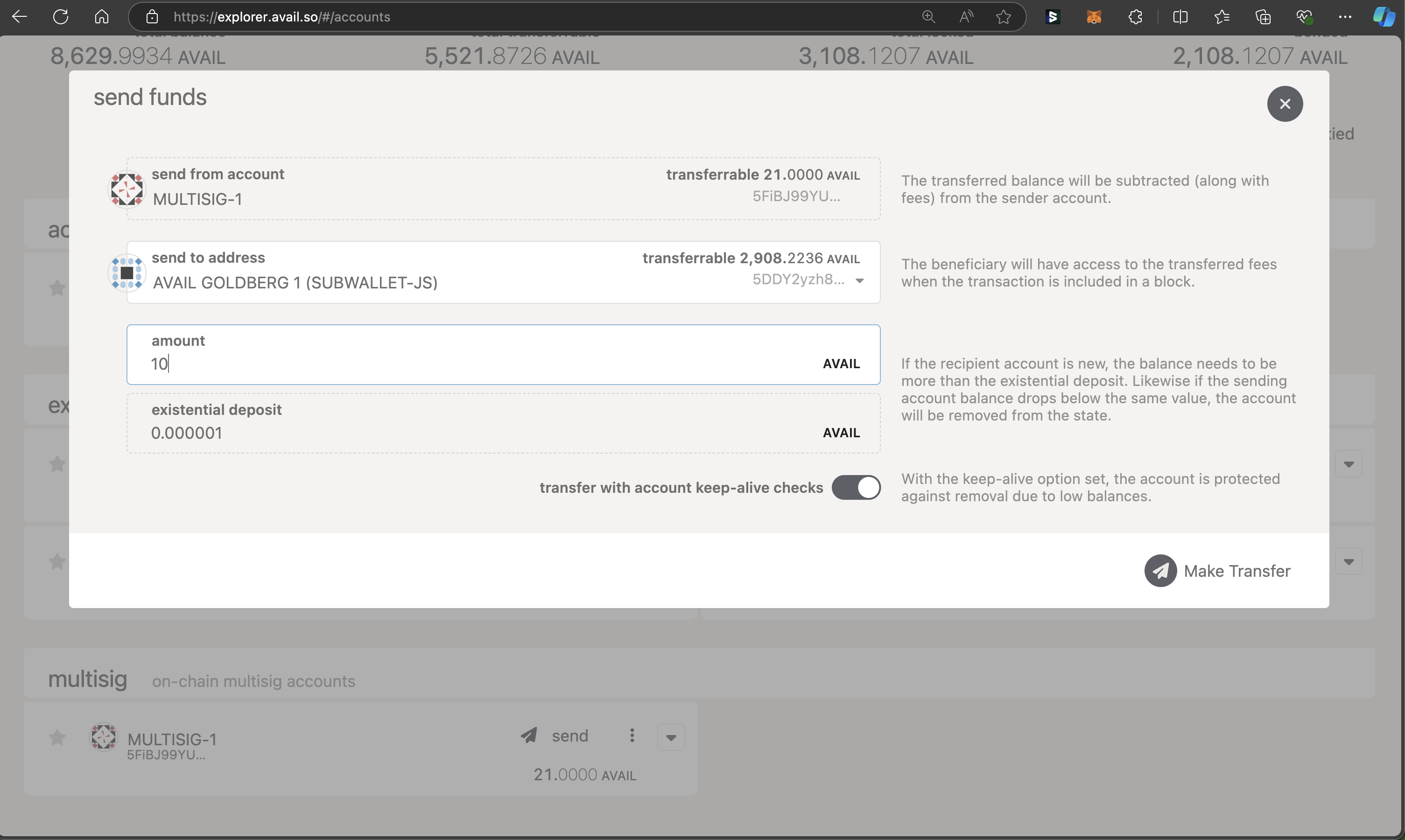 You will now be able to sign a balances.transferKeepAlive transaction from the multisig account. This extrinsic allows you to transfer funds from one account to another.